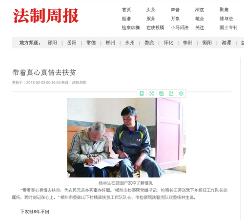 “‘带着真心真情去扶贫,为农民兄弟办实事办好事。’郴州市检察院党组书记、检察长江涛送我下乡担任工作队长的嘱托,我时刻记在心上。” 郴州市委驻山下村精准扶贫工作队队长、市检察院法警支队政委杨林生说。
